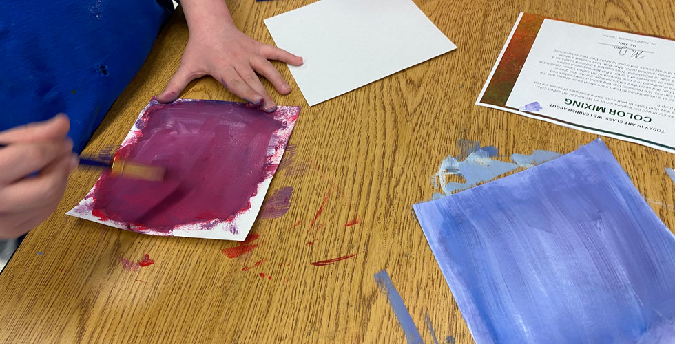 Today, we applied our knowledge to start mixing colors! Using the three primary colors and white, each young artist made 3 different colors on 3 sheets of paper. We will be using these in our next class as part of another community art project.