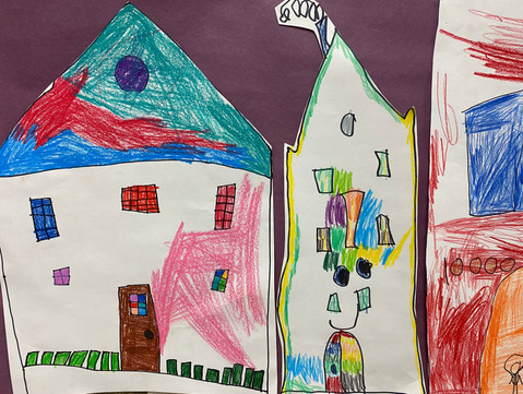 Kindergarteners have been learning about ways that art can help us reimagine our community. We read a book called "Maybe Something Beautiful" by Isabel Campoy and Theresa Howell. In this book, a young girl named Mira reimagines her town by painting it with the help of a muralist. In class, we discussed what it means to be a community. We talked about different buildings seen around Evansville and ways that they could be reimagined from an artistic lens. Every student designed their own dream building and a dream plant. We put them together in a large collage to create a whole neighborhood of reimagined buildings in Evansville. Check out the incredible hallway display that they put together!